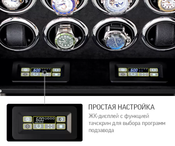 15 режимов подзавода подходят для любых автоматических часов. Можно выбрать количество оборотов в сутки (TPD) и направление вращения.