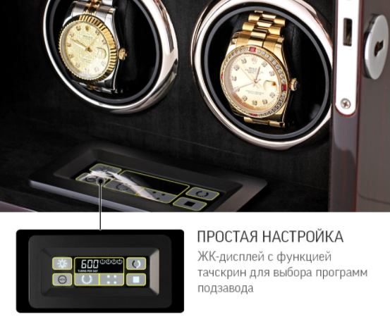 15 режимов подзавода подходят для любых автоматических часов. Можно выбрать количество оборотов в сутки (TPD) и направление вращения.