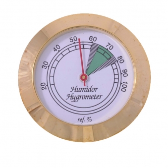 Гигрометр стрелочный с пружиной, реагирующей на изменение влажности воздуха. Предназначен для примерной оценки влажности в хьюмидоре. Перед первой установкой в хьюмидор и ежегодно в дальнейшем механические гигрометры требуют калибровки: положите прибор рядом с эталонным или заверните его во влажную ткань на полчаса; если показания будут отличаться от 95 %, снимите заднюю крышку и аккуратно поверните весь механизм с пружиной вокруг оси, чтобы стрелка указывала на 95%. В комплекте магнит для крепления на крышку или стенку хьюмидора. Может быть встроен в посадочное гнездо на корпусе хьюмидора. Посадочный диаметр — 41 мм. Корпус гигрометра — металл.