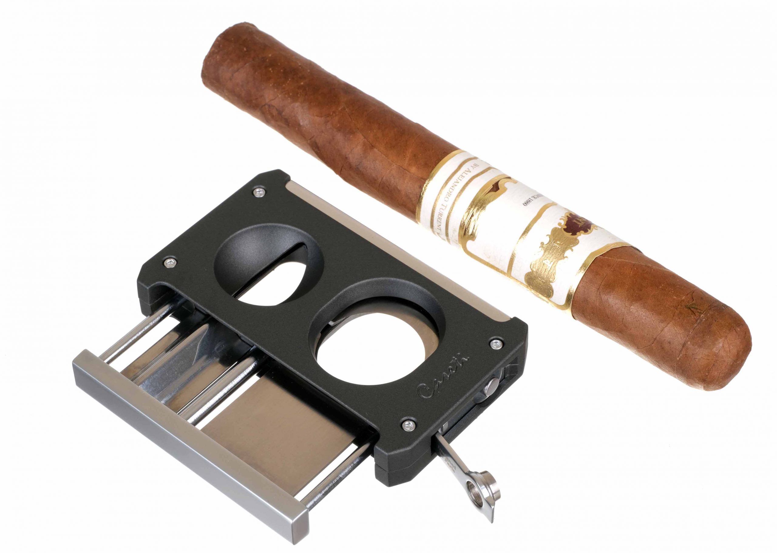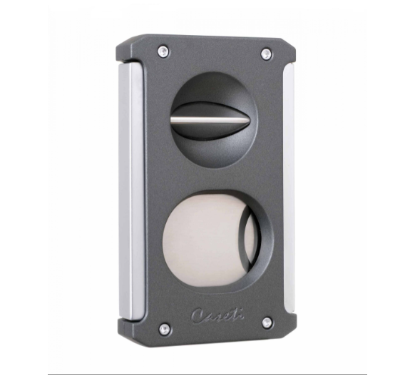 Новая сигарная гильотина от французского бренда Caseti. 3 инструмента в 1 корпусе: двусторонняя гильотина диаметром 23 мм, V-каттер «Кошачий глаз», пробойник 7 мм. Для сигар диаметром до 23 мм.