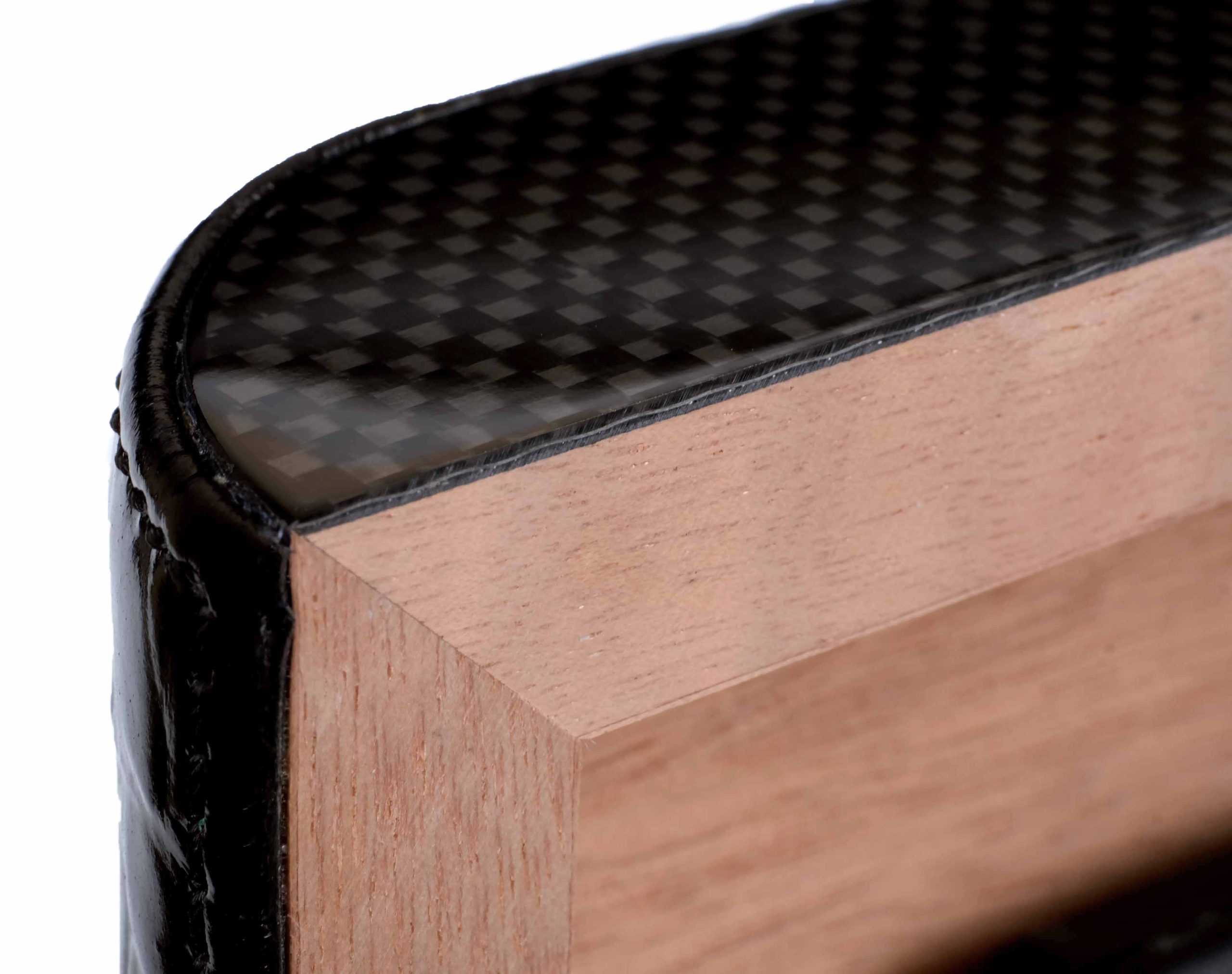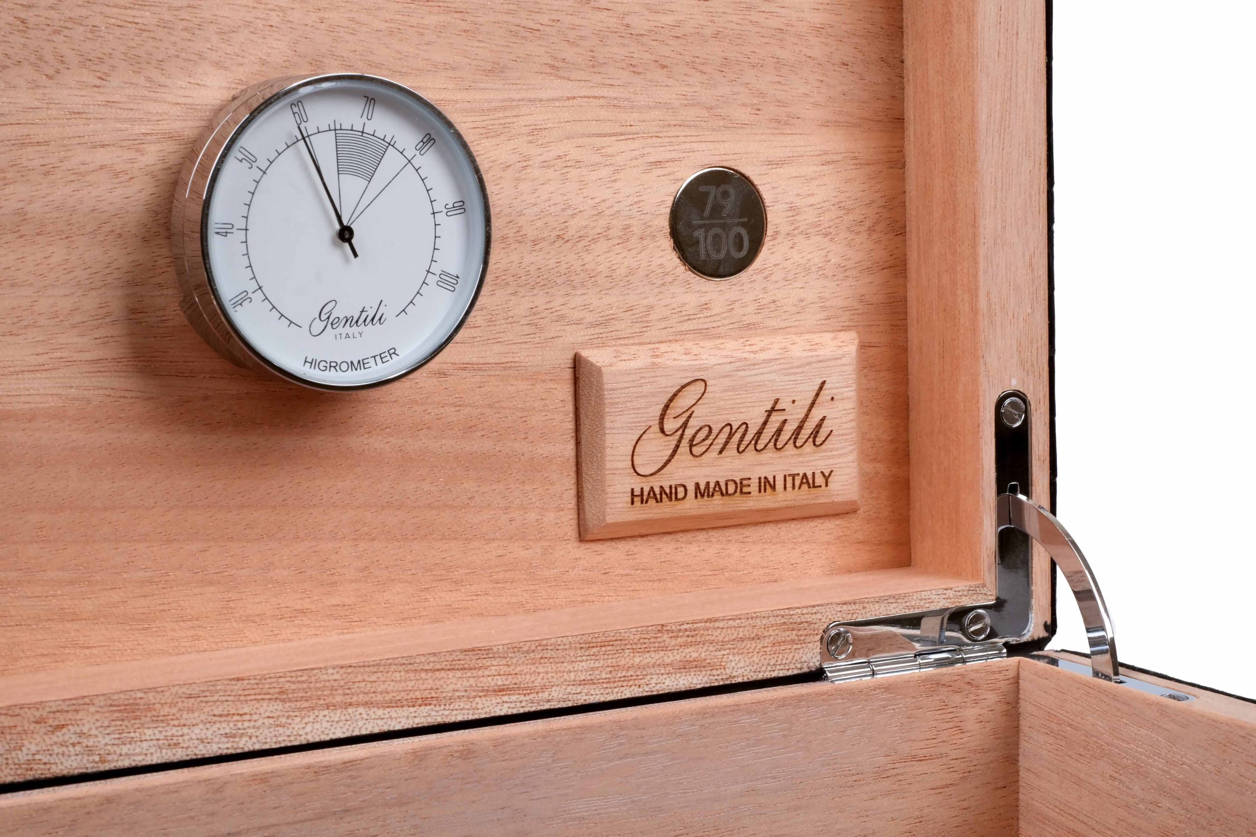 Хьюмидор на 20-25 сигар лимитированной серии из 100 штук от итальянских мастеров фабрики Fabrizio Gentili SRL. Исполнен в классическом итальянском стиле — элегантное сочетание лучших материалов в единое целое: дерева, карбона, кожи, металла. Корпус представляет собой комбинацию нескольких видов дерева, что обеспечивает стойкость к деформации при колебаниях температуры и влажности. Внутренняя отделка выполнена из испанского кедра. Снаружи — углеродное волокно (Карбон), покрытый 7-ю слоями лака, а также натуральная телячья кожа с тиснением и лакировкой. На внутренней стороне крышки — табличка с порядковым номером изделия в серии из 100 шт. В комплекте увлажнитель с акриловым полимером, итальянский гигрометр. Подарочная упаковка. В качестве настольного сигарного набора идеально сочетается с пепельницей Gentili 930, отделанной кожей и карбоном. Ручная работа, сделано в Италии.