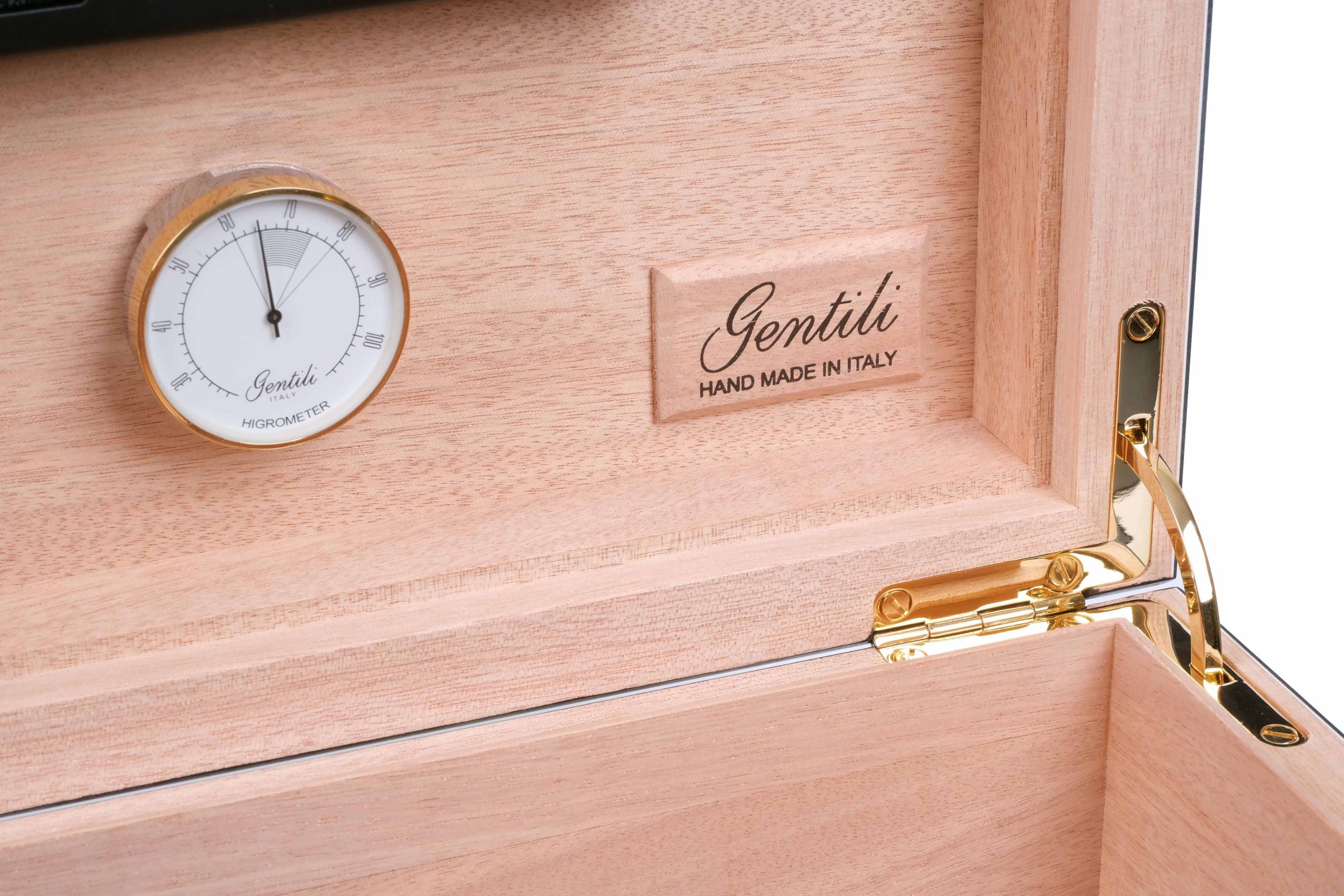 Новый хьюмидор премиум-класса на 50 сигар от итальянских мастеров фабрики Fabrizio Gentili SRL. Модель характеризуется строгим классическим дизайном, подходящим для большинства интерьеров, и безупречностью в исполнении. Корпус представляет собой комбинацию нескольких видов дерева, что обеспечивает стойкость к деформации при колебаниях температуры и влажности. Внутренняя отделка выполнена из испанского кедра. На верхней поверхности хьюмидора вручную выполнен рисунок с финишным покрытием 7-ю слоями рояльного лака. В комплекте увлажнитель с акриловым полимером, итальянский гигрометр, фирменный буклет Gentili с информацией о компании и мультиязычной инструкцией по уходу. Подарочная упаковка. Ручная работа, сделано в Италии.