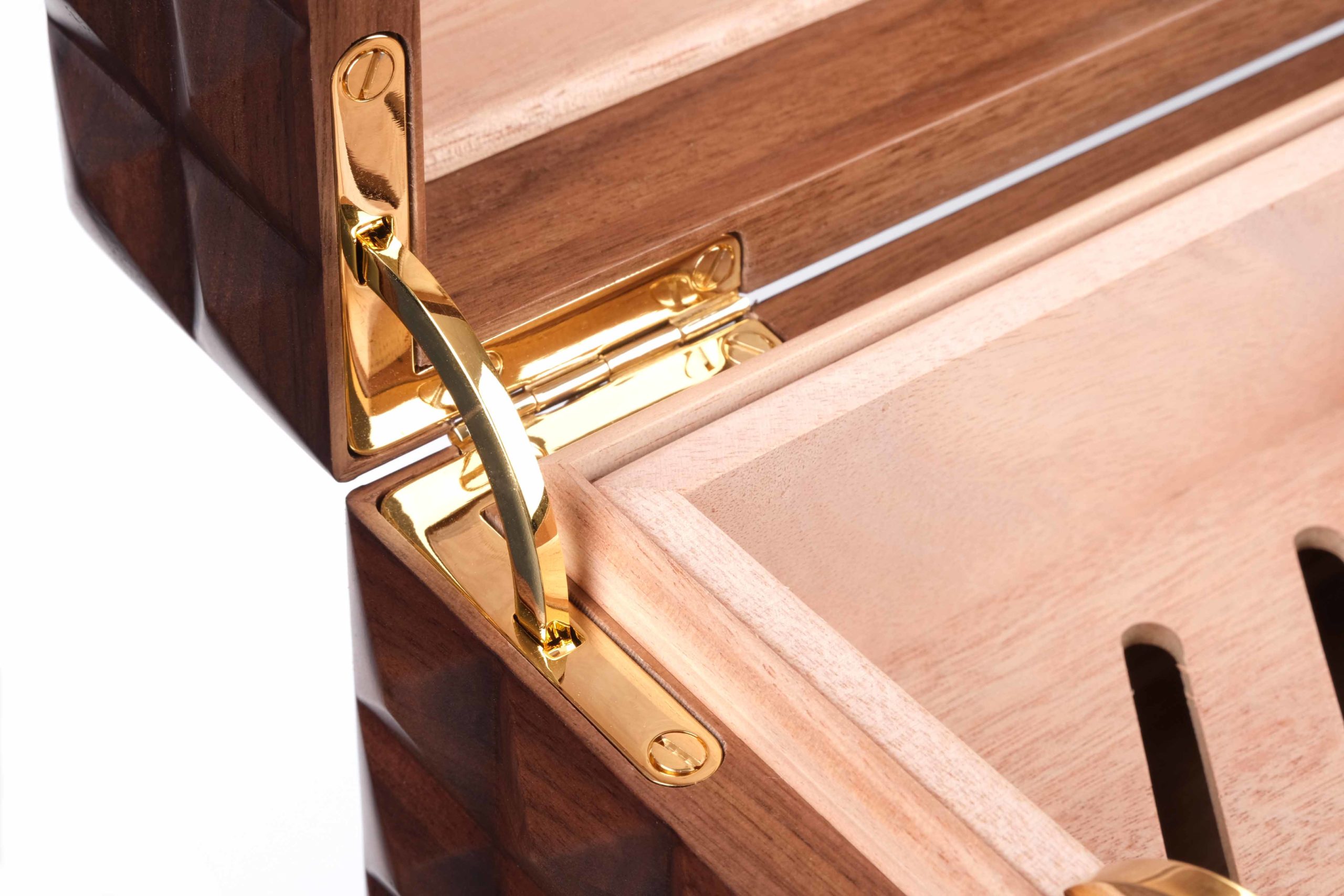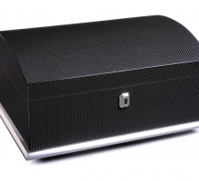 Внутренняя отделка — из испанского кедра, признанного лучшим материалом для хранения сигар. Он естественным образом регулирует влажность и помогает сохранять аромат табака. Внешняя отделка — благородный шпон Черного Американского Ореха, отличающегося глубоким цветом и высокой плотностью. Поверхность покрыта семью слоями лака, что придаёт прочность, глубину блеска и защищает от внешних воздействий. Внутреннее пространство организовано с учётом удобства пользователя: съёмный лоток позволяет разместить сигары в два яруса, две кедровые перегородки — для гибкой организации хранения. Комплектация: Увлажнитель с акриловым полимерным сердечником — обеспечивает стабильную влажность длительное время; Аналоговый итальянский гигрометр — точное измерение влажности в диапазоне 50–90%;