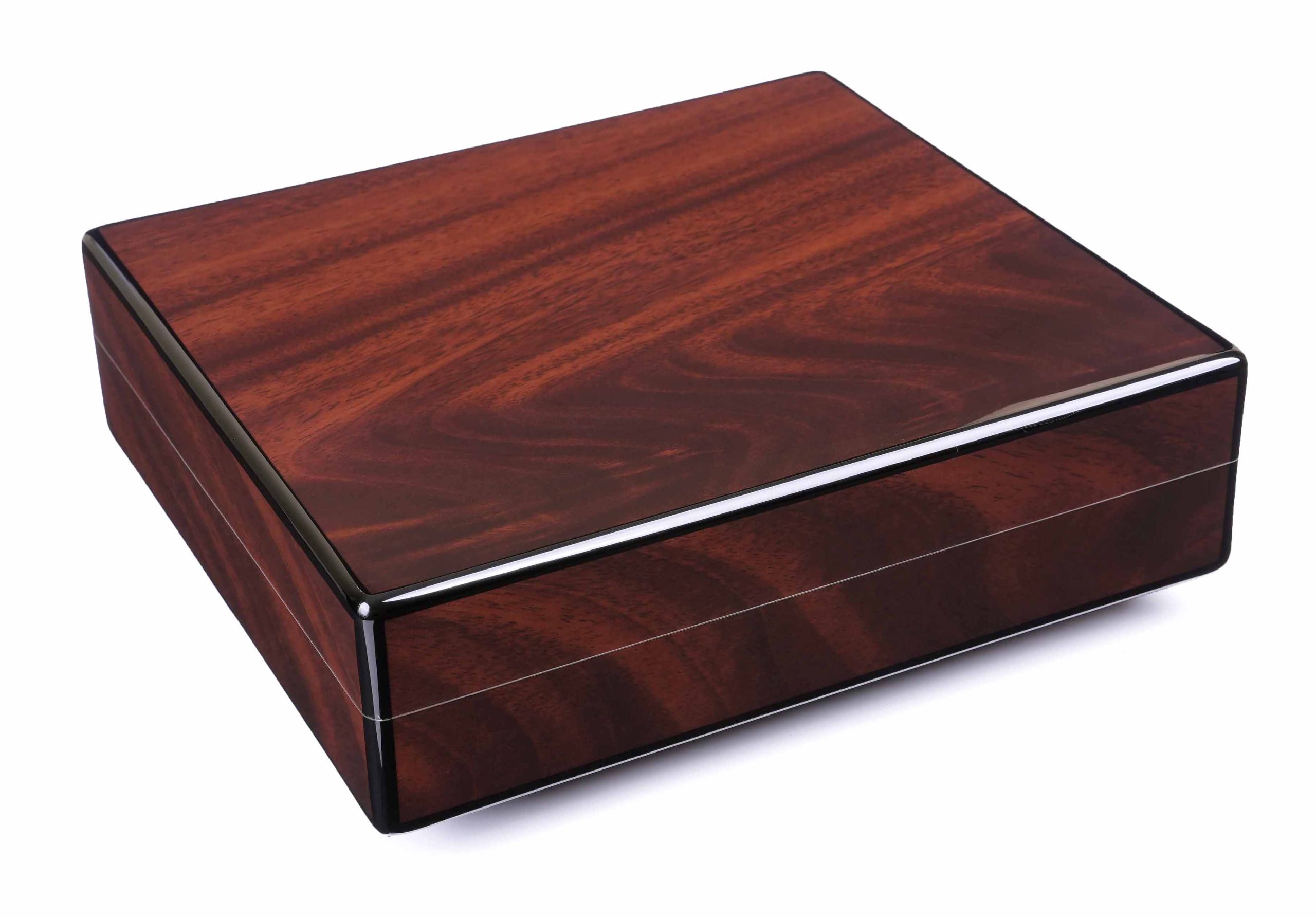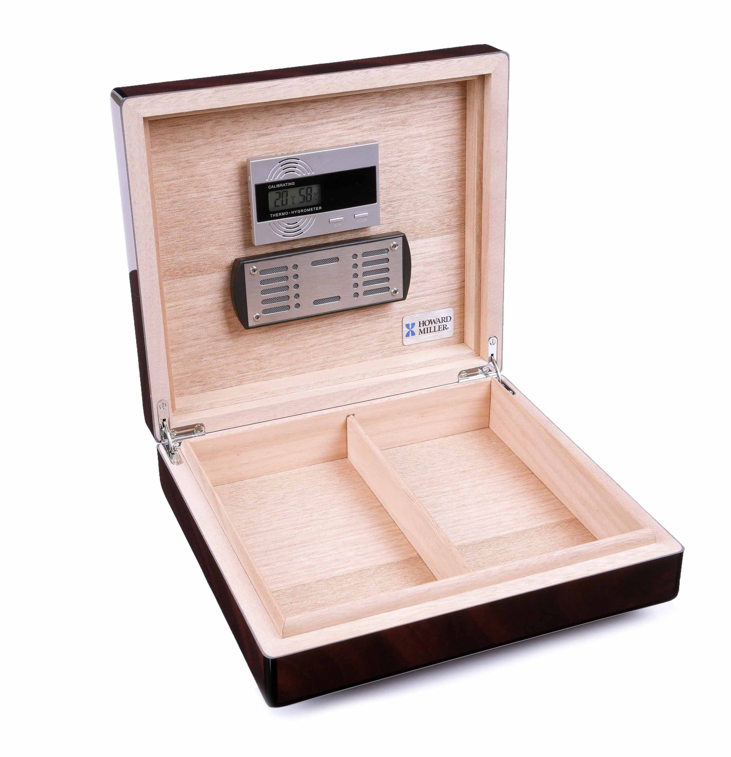 Хьюмидор премиум-класса на 30 сигар от американской компании Howard Miller — известного производителя предметов интерьера. Массивное изделие со строгим классическим дизайном и качественным исполнением. Внутренняя отделка из испанского кедра. Корпус отделан тонированным шпоном Красного дерева и многослойным глянцевым лаком. В комплекте с хьюмидором Howard Miller идут увлажнитель с акриловым полимером последнего поколения и высокоточный электронный термогигрометр, подробная инструкция по эксплуатации. Тканевый чехол и подарочная коробка.
