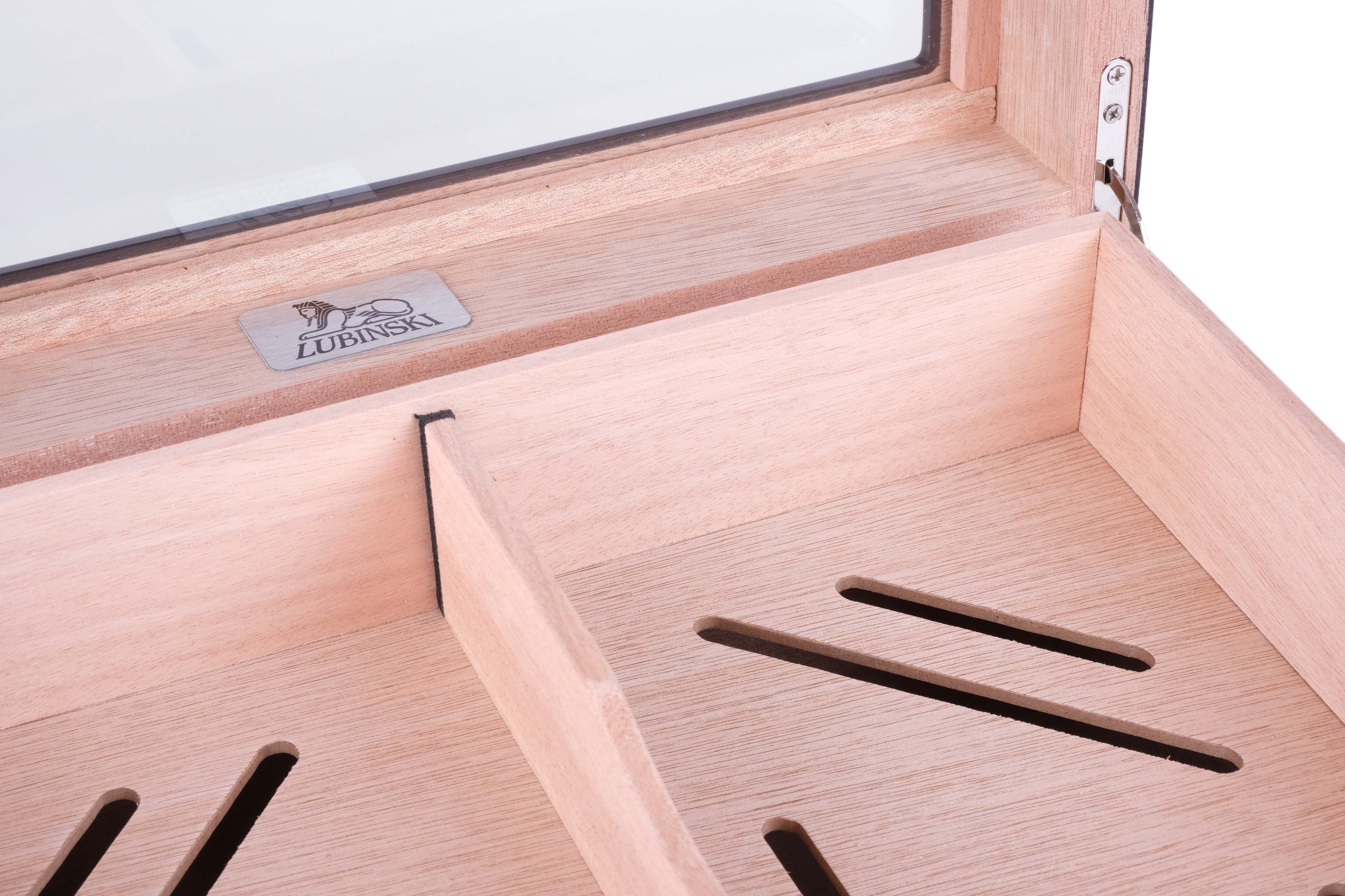 Хьюмидор премиум-класса на 60 сигар от итальянской компании Lubinski — крупнейшего производителя и дистрибьютора курительных аксессуаров в Италии (подробнее о компании и ее продукции можно узнать на сайте www.lubinski.it). Массивное изделие со строгим классическим дизайном и качественным исполнением всех деталей. Внутренняя отделка из испанского кедра. Корпус отделан Карбоном и многослойным лаком. Оборудован съемным лотком, а также калибруемым электронным термогигрометром. Увлажнитель с акриловым полимером нового поколения в съемном футляре из кедра.