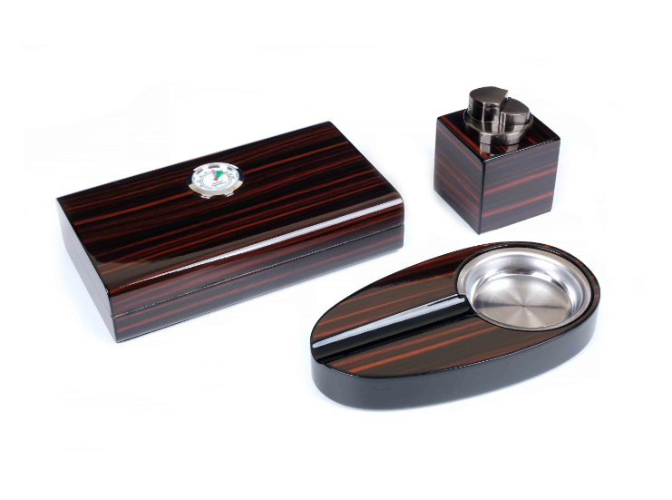 Настольный набор сигарных аксессуаров от итальянской компании Lubinski SRL, состоящий из трех предметов: хьюмидора для хранения сигар, элегантной пепельницы и зажигалки. Идеальный подарок для любого ценителя сигар.