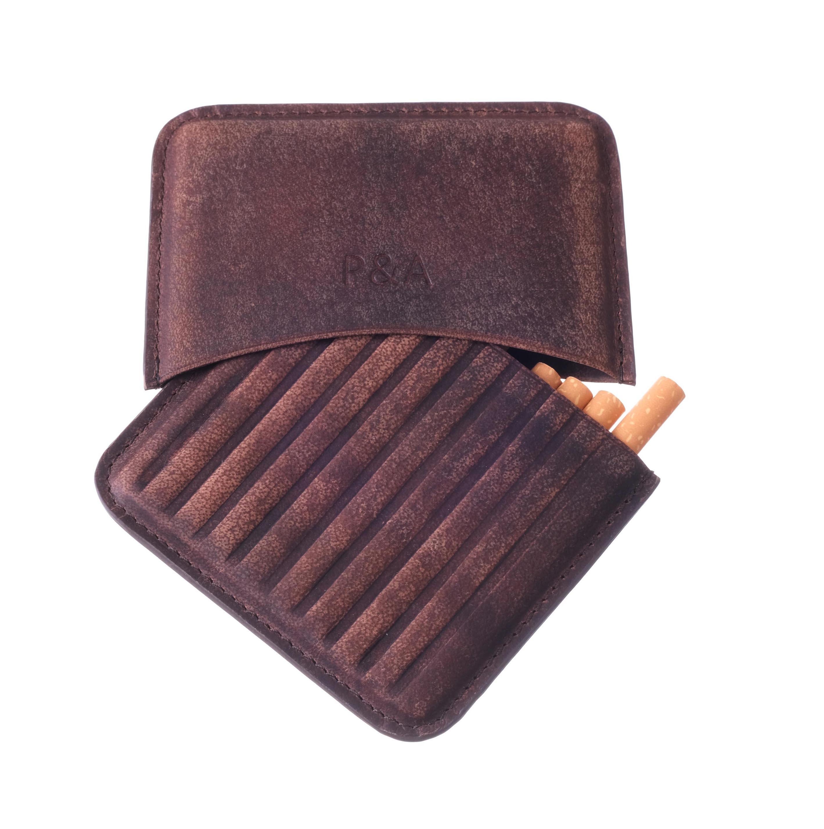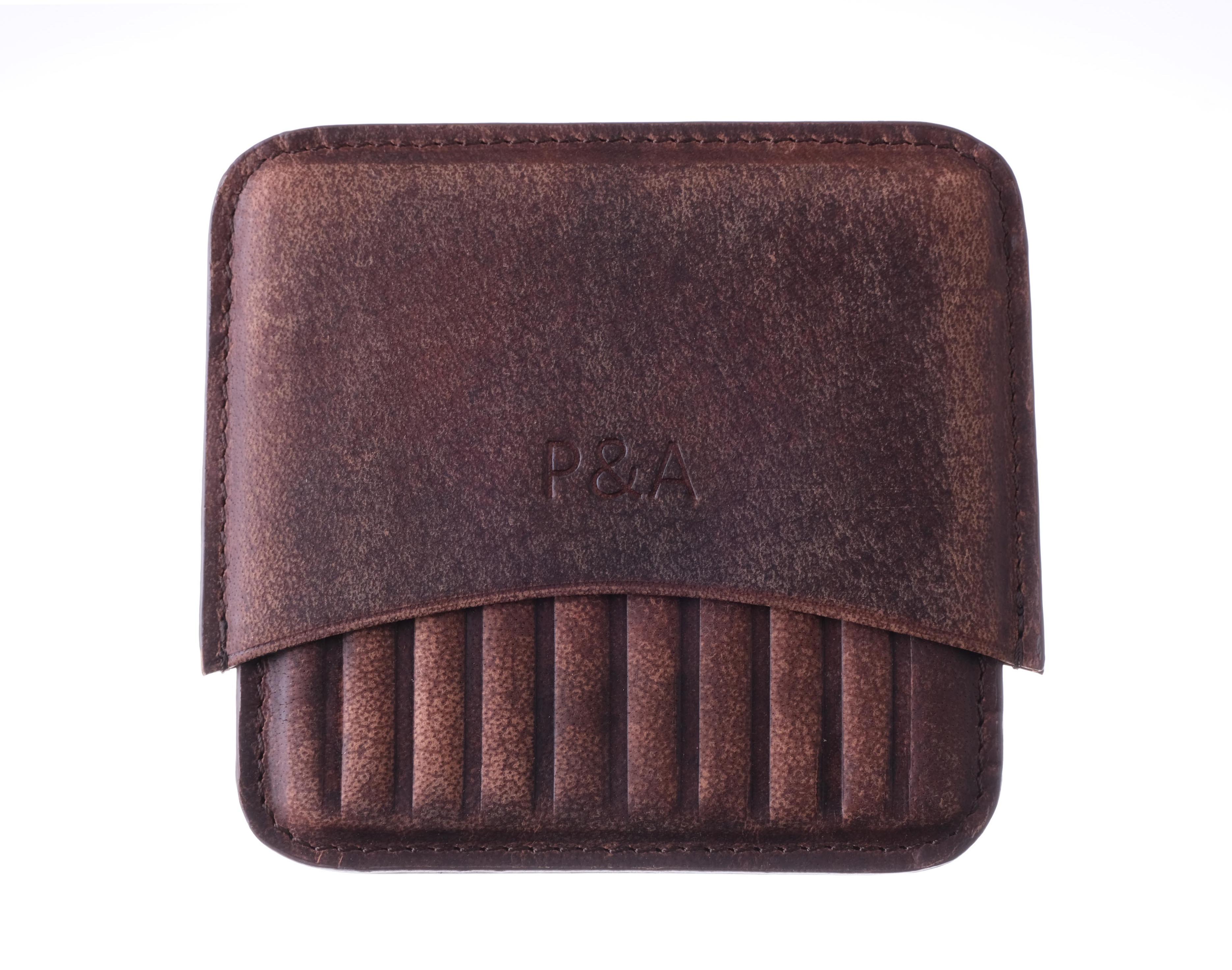 Сигартеница P&A из высококачественной натуральной буйволиной кожи, чрезвычайно прочной и износостойкой, с финишной отделкой «искусственное старение» в винтажном стиле Дикого Запада. Производится итальянской компанией Parenti-Agostinelli из Милана.
