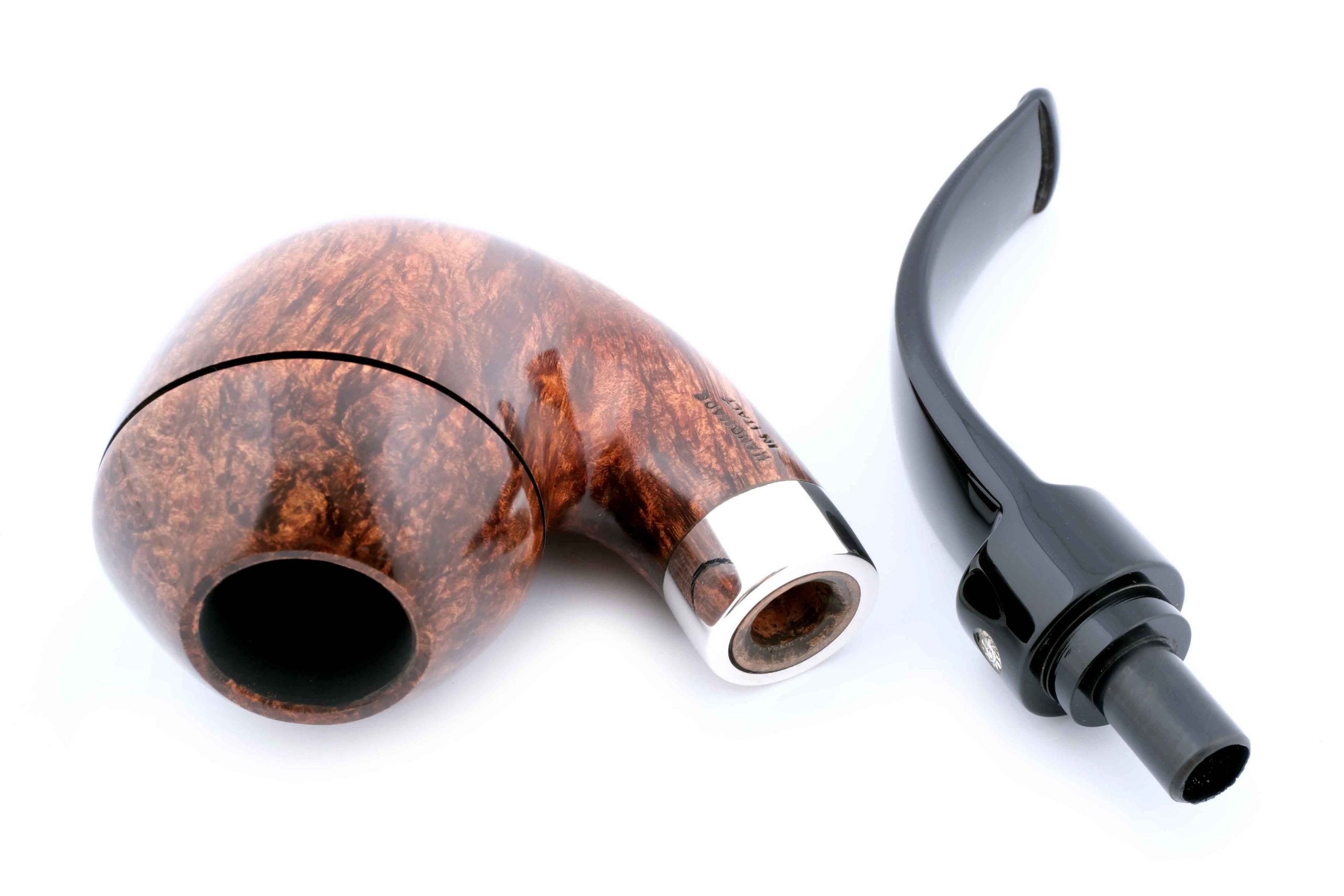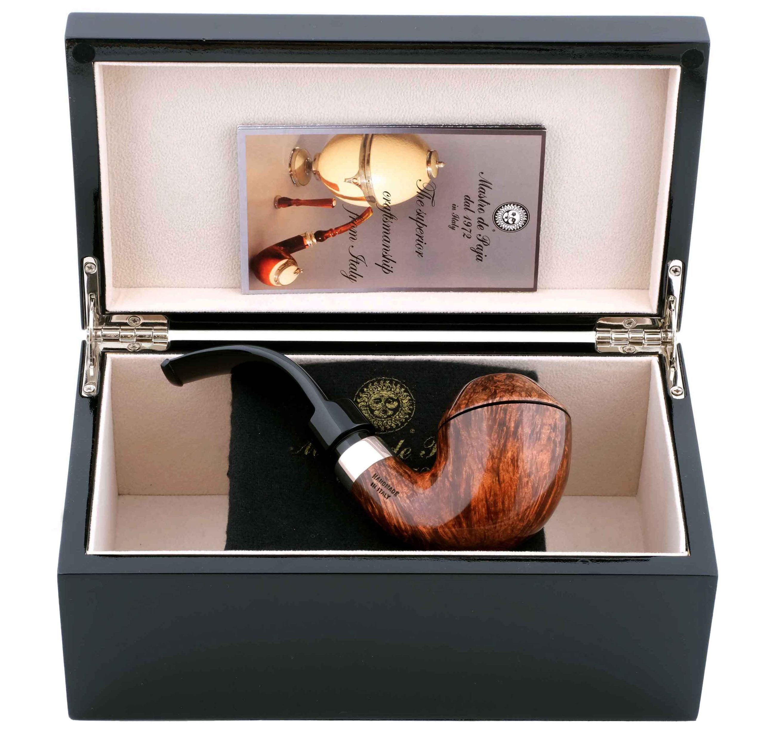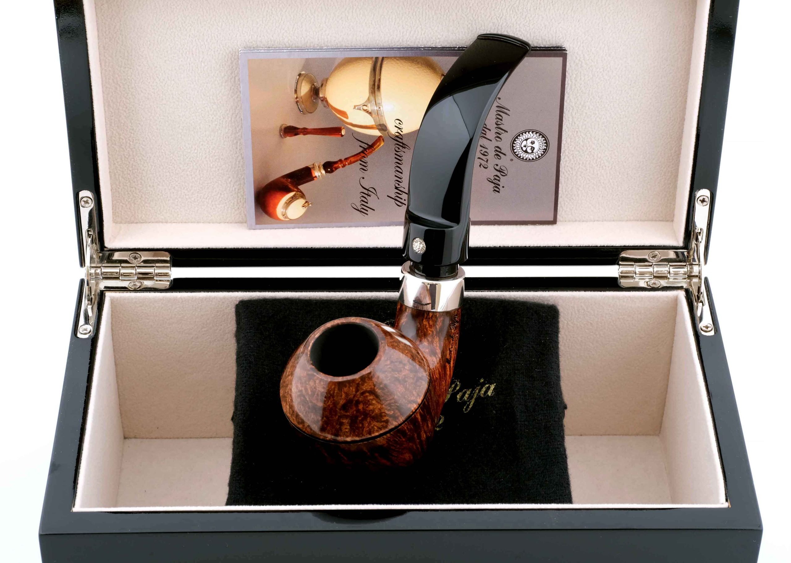 Оригинальная трубка модели Ciocco, посвященная прошедшему 50-летнему юбилею мастерской Мастро де Пайа. Принадлежит к лимитированной серии Unica, где каждый экземпляр неповторим, имея свой индивидуальный дизайн. Кольцо на чубуке — серебро 925 пробы. Фильтр 9 мм. Вес 93 гр. Длина трубки 15 см. Диаметр чашки 49 мм. Высота чашки 60 мм. Диаметр табачной камеры 20 мм., глубина 46 мм. В комплекте подарочная шкатулка, фирменный кисет и буклет компании Mastro de Paja. Ручная работа