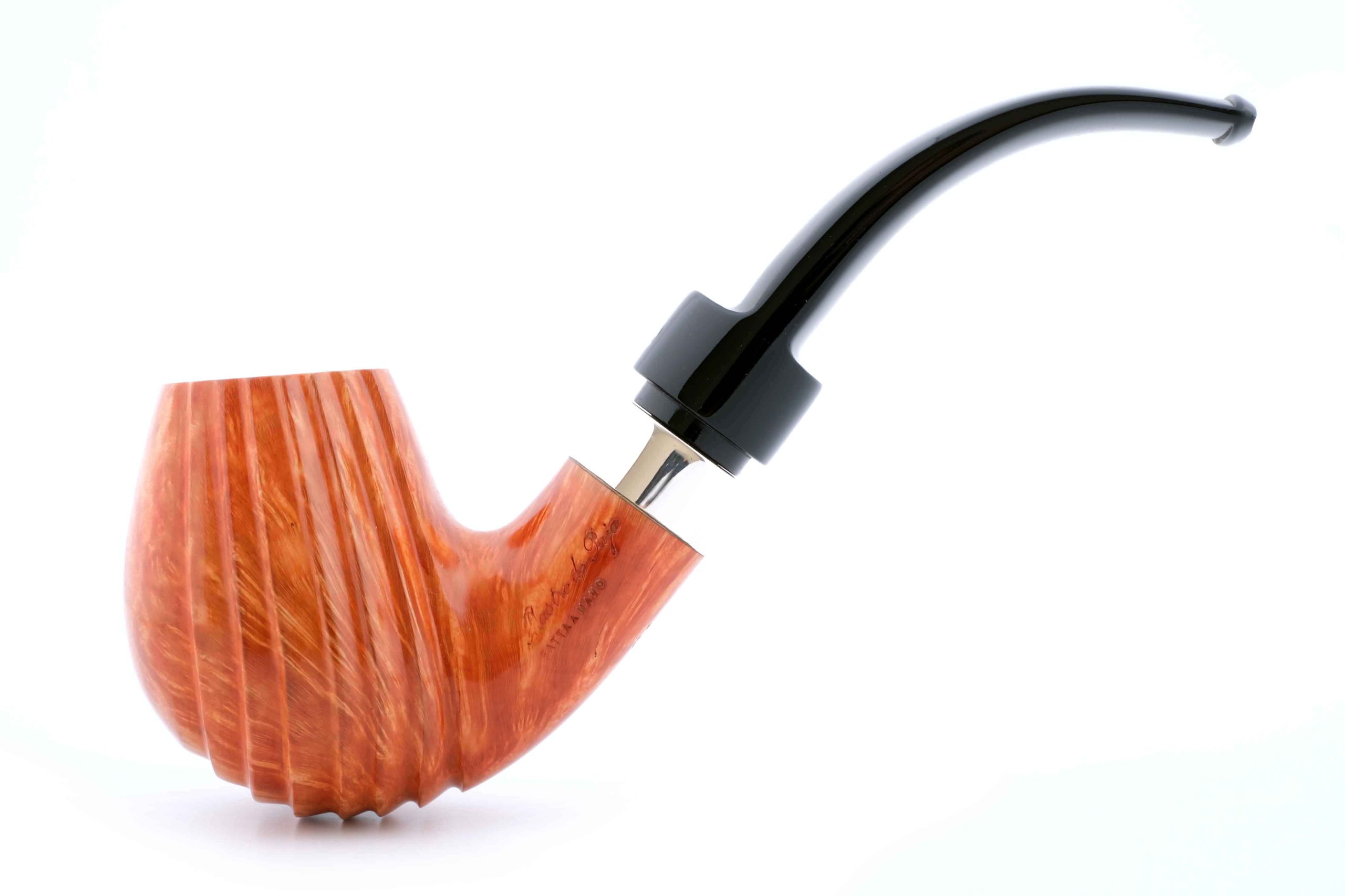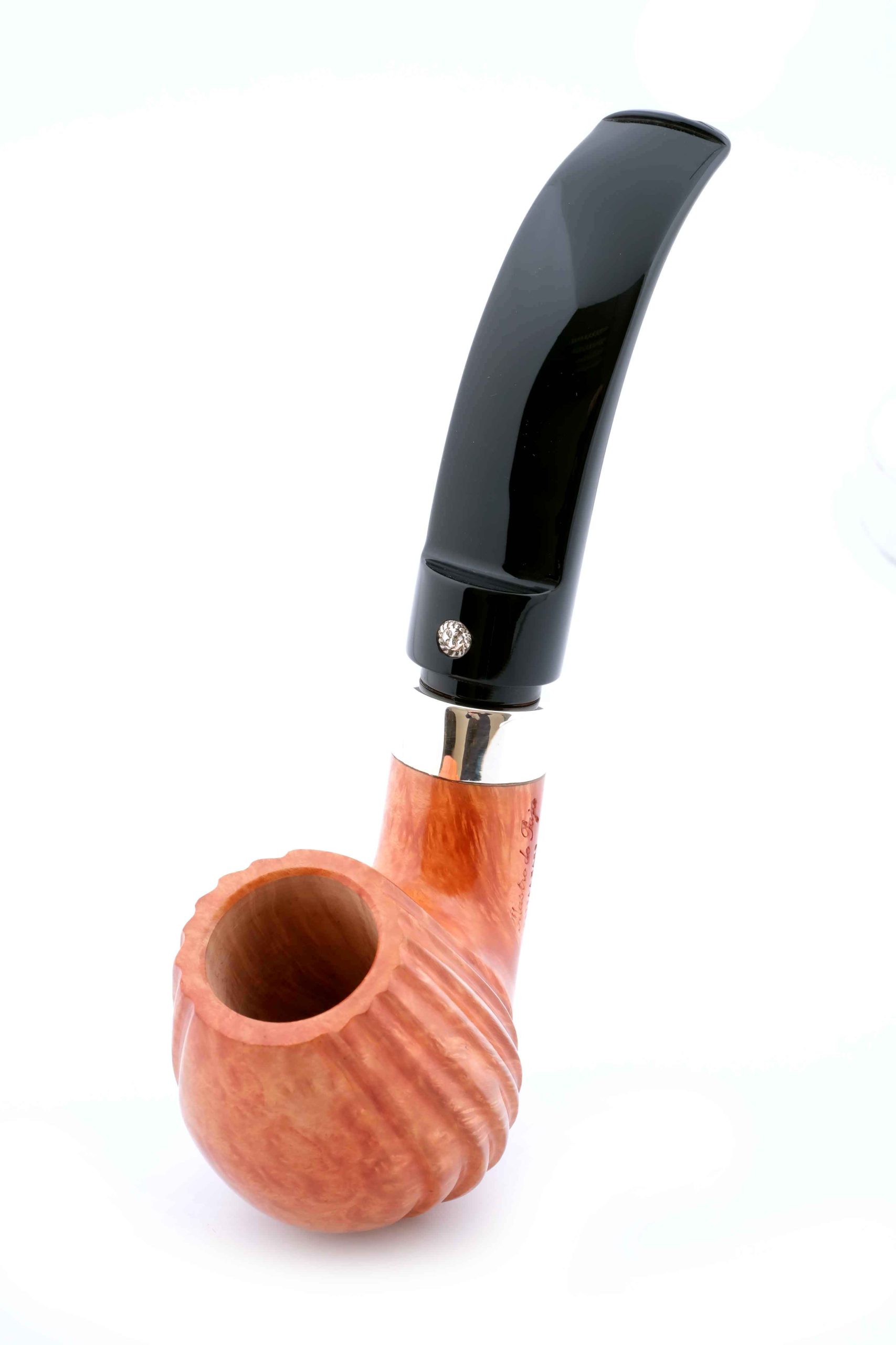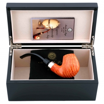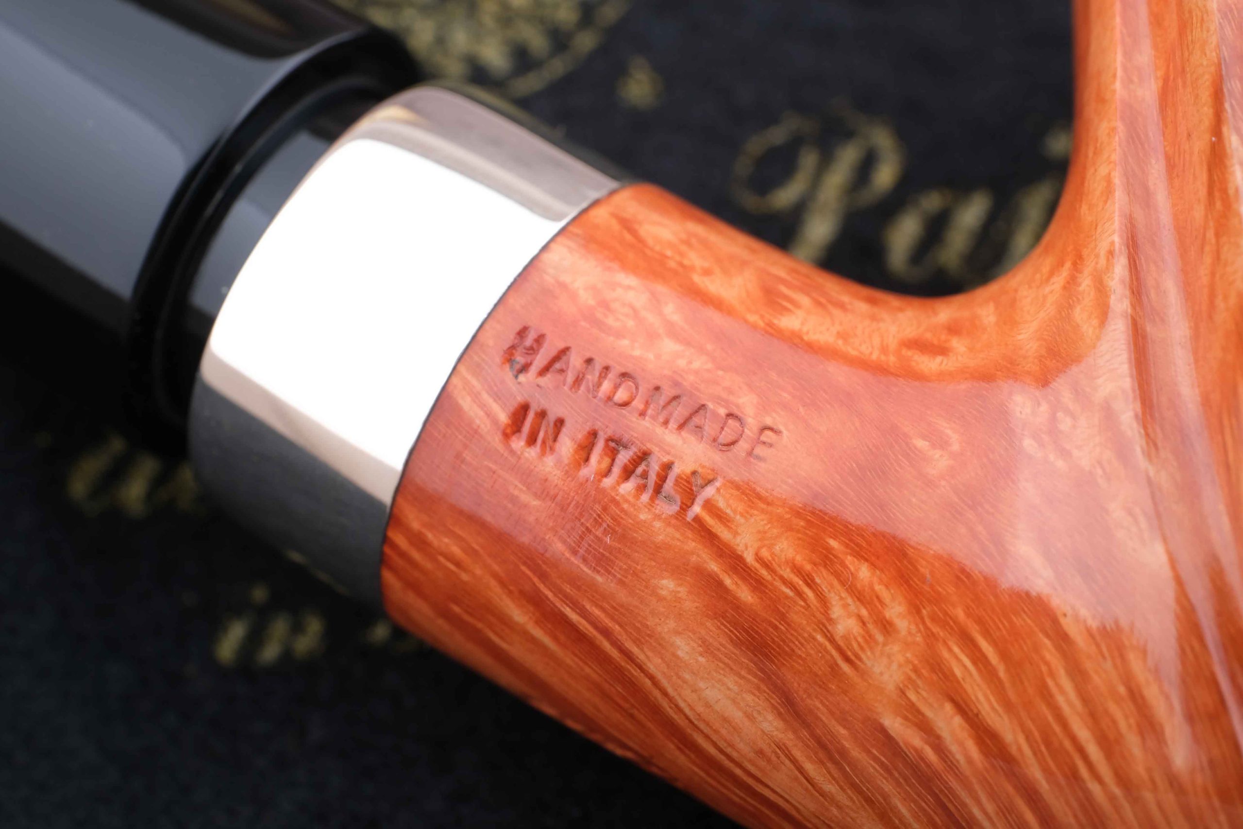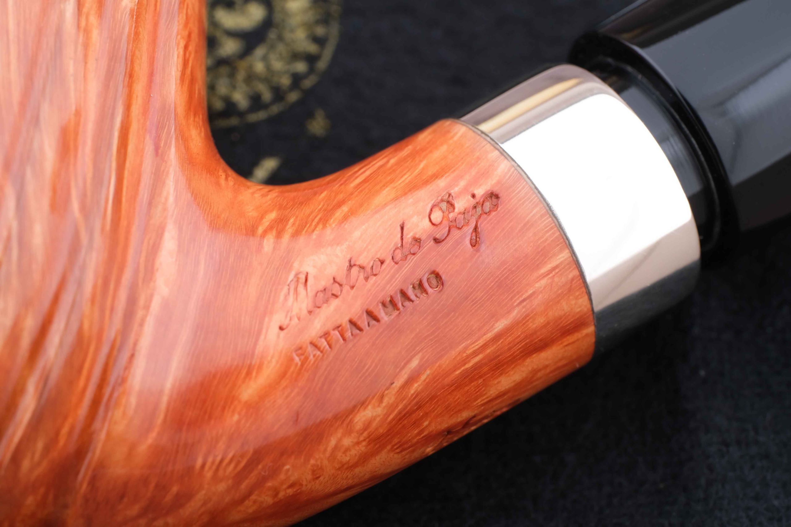 Оригинальная трубка высшего грэйда модели Ciocco, посвященная прошедшему 50-летнему юбилею мастерской Мастро де Пайа. Принадлежит к лимитированной серии Unica, где каждый экземпляр неповторим, имея свой индивидуальный дизайн. Светлая трубка имеет натуральный цвет бриара, покрытого только натуральным карнаубским воском. Кольцо на чубуке — серебро 925 пробы. Фильтр 9 мм. Вес 79 гр. Длина трубки 15 см. Диаметр чашки 44 мм. Высота чашки 56 мм. Диаметр табачной камеры 20 мм., глубина 45 мм. В комплекте подарочная шкатулка, фирменный кисет и буклет компании Mastro de Paja. Ручная работа