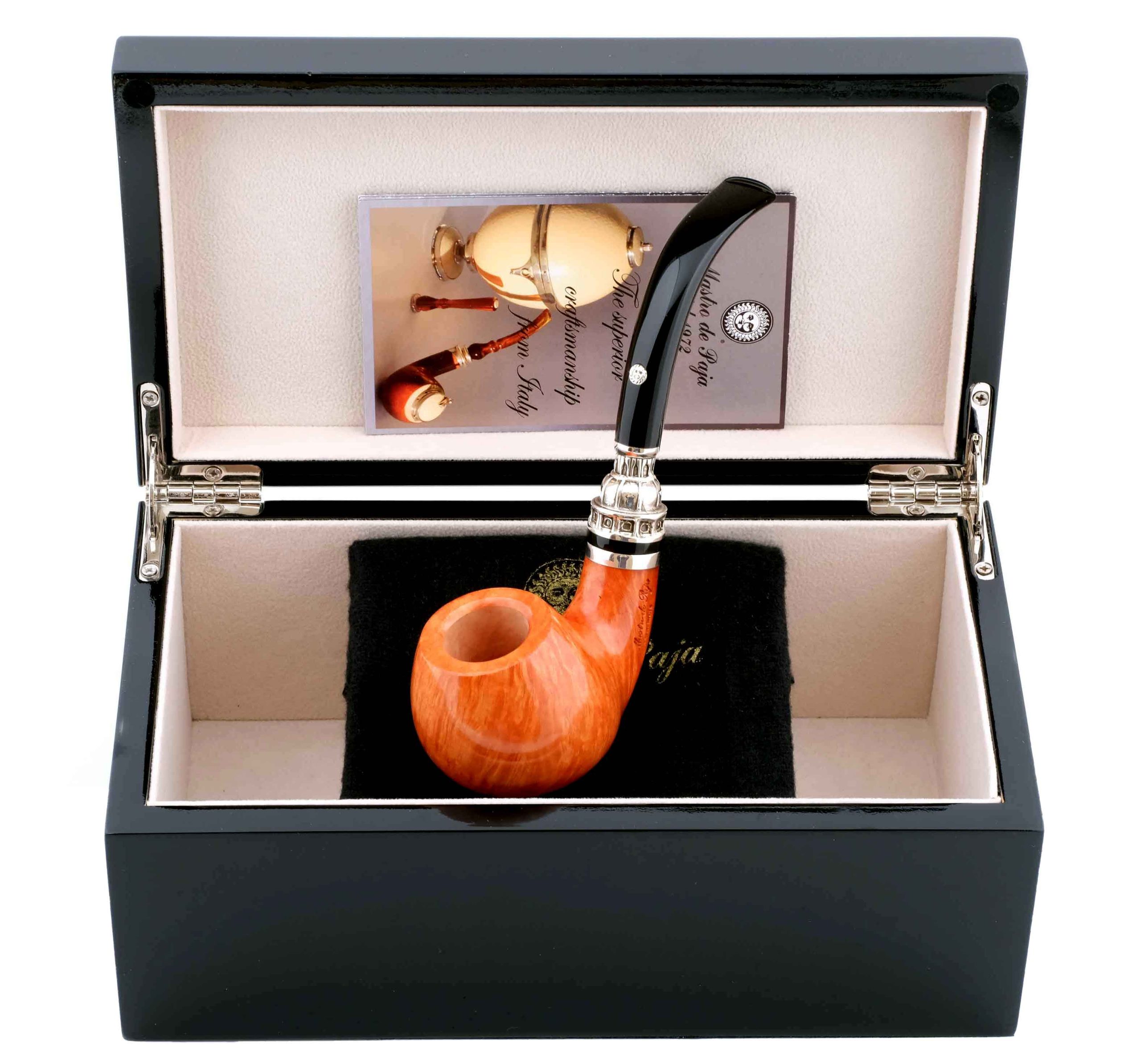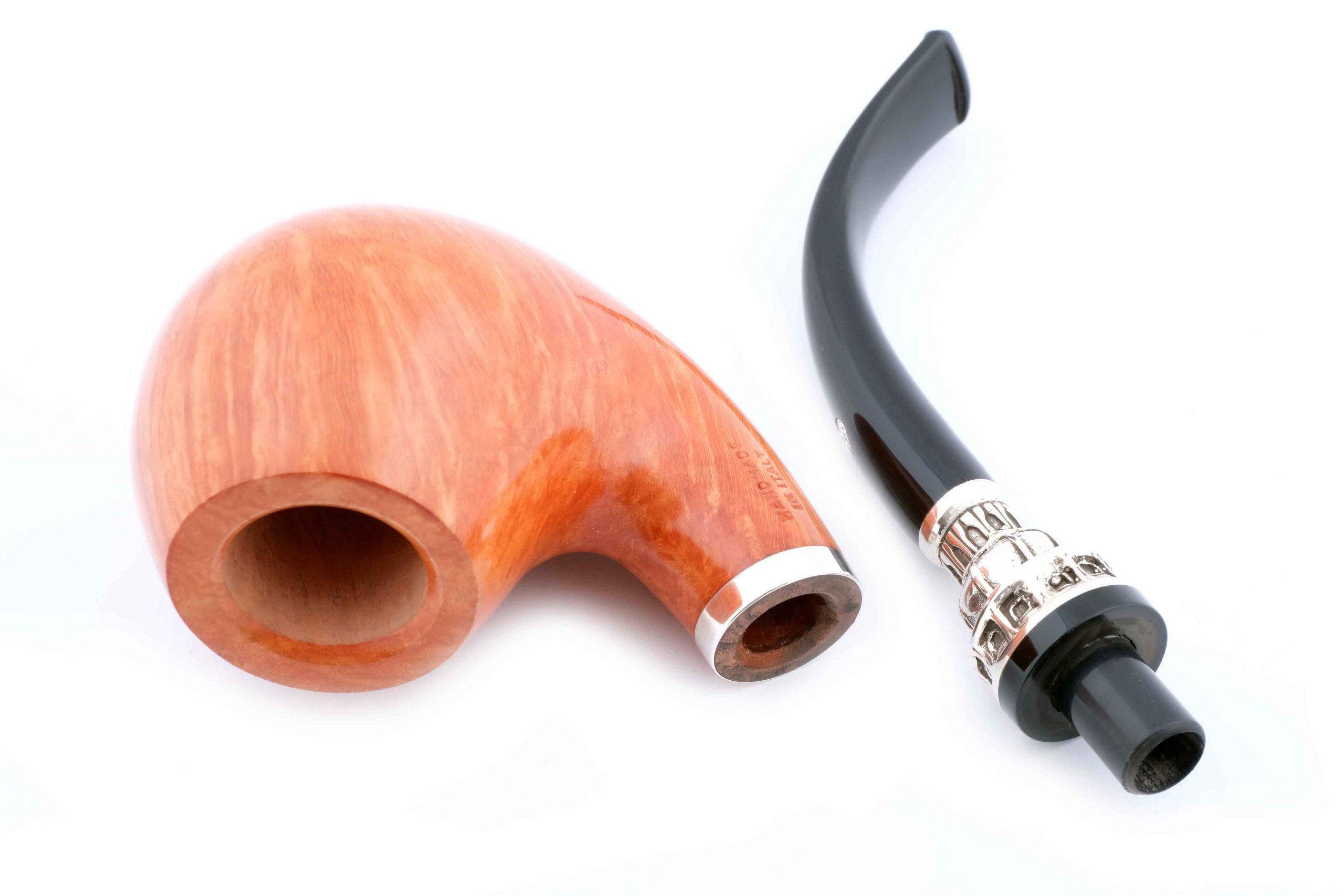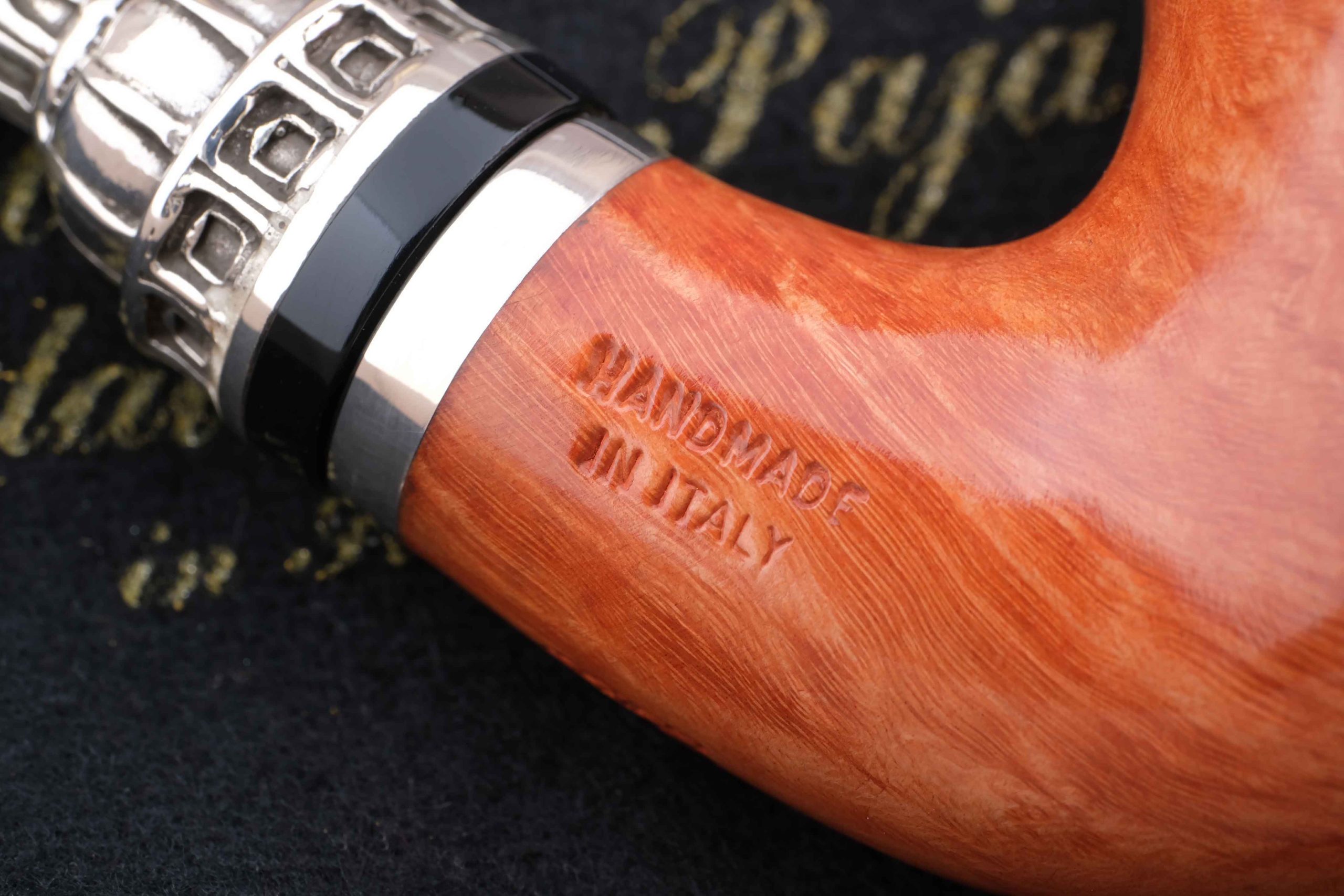 Трубка Мастро де Пайа San Pietro высшего грэйда, создана в честь собора Святого Петра в Риме. Грэйд OB. Светлая трубка имеет натуральный цвет бриара, покрытого только натуральным карнаубским воском. Мундштук — акрил. Фигурное кольцо в виде купола собора сделано из серебра 925 пробы. Фильтр 9 мм. Вес 82 гр. Длина трубки 16 см. Диаметр чашки 49 мм. Высота чашки 50 мм. Диаметр табачной камеры 20 мм., глубина 39 мм. В комплекте подарочная шкатулка, фирменный кисет и буклет компании Mastro de Paja. Ручная работа.
