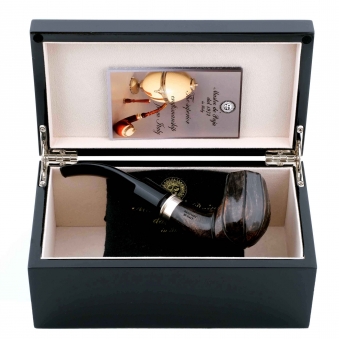 Оригинальная трубка модели Ciocco, посвященная прошедшему 50-летнему юбилею мастерской Мастро де Пайа. Принадлежит к лимитированной серии Unica, где каждый экземпляр неповторим, имея свой индивидуальный дизайн. Кольцо на чубуке — серебро 925 пробы. Фильтр 9 мм. Вес 93 гр. Длина трубки 15 см. Диаметр чашки 43 мм. Высота чашки 62 мм. Диаметр табачной камеры 20 мм., глубина 49 мм. В комплекте подарочная шкатулка, фирменный кисет и буклет компании Mastro de Paja. Ручная работа