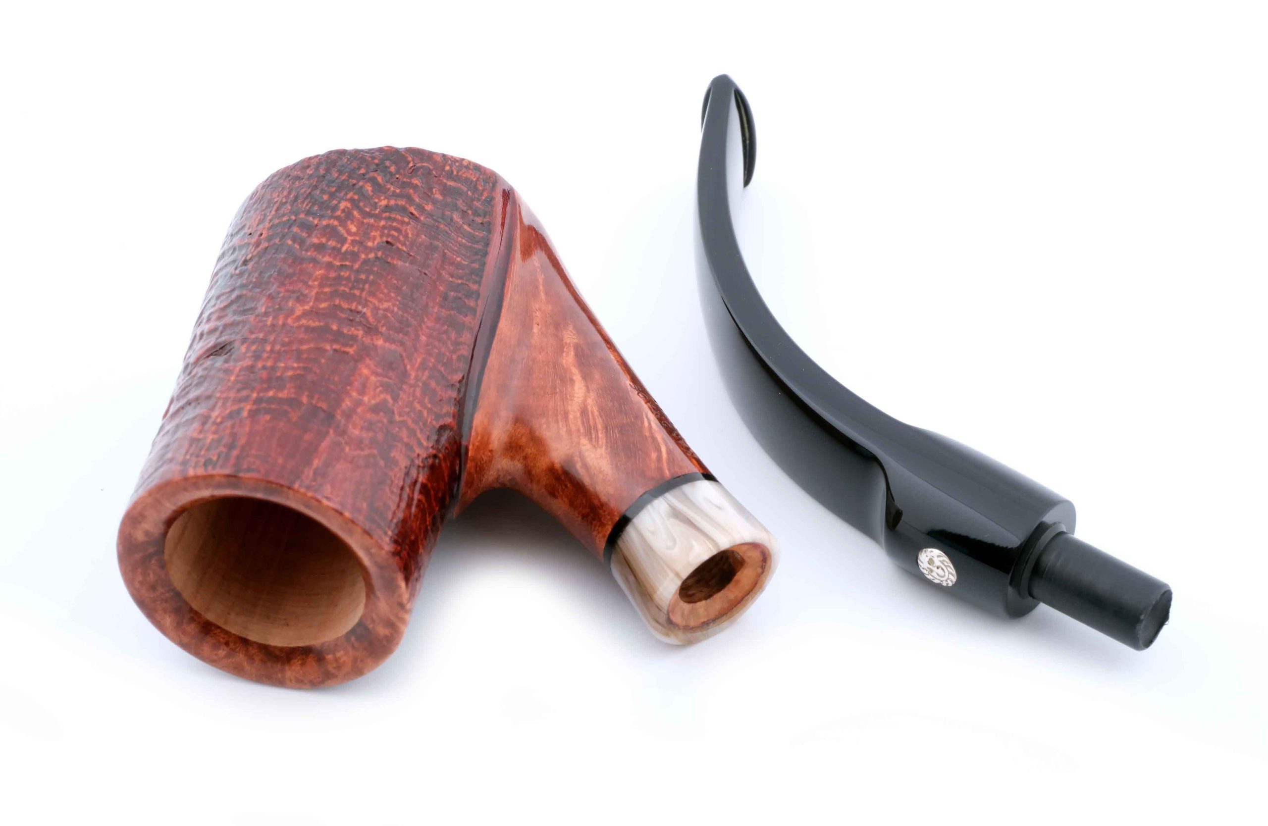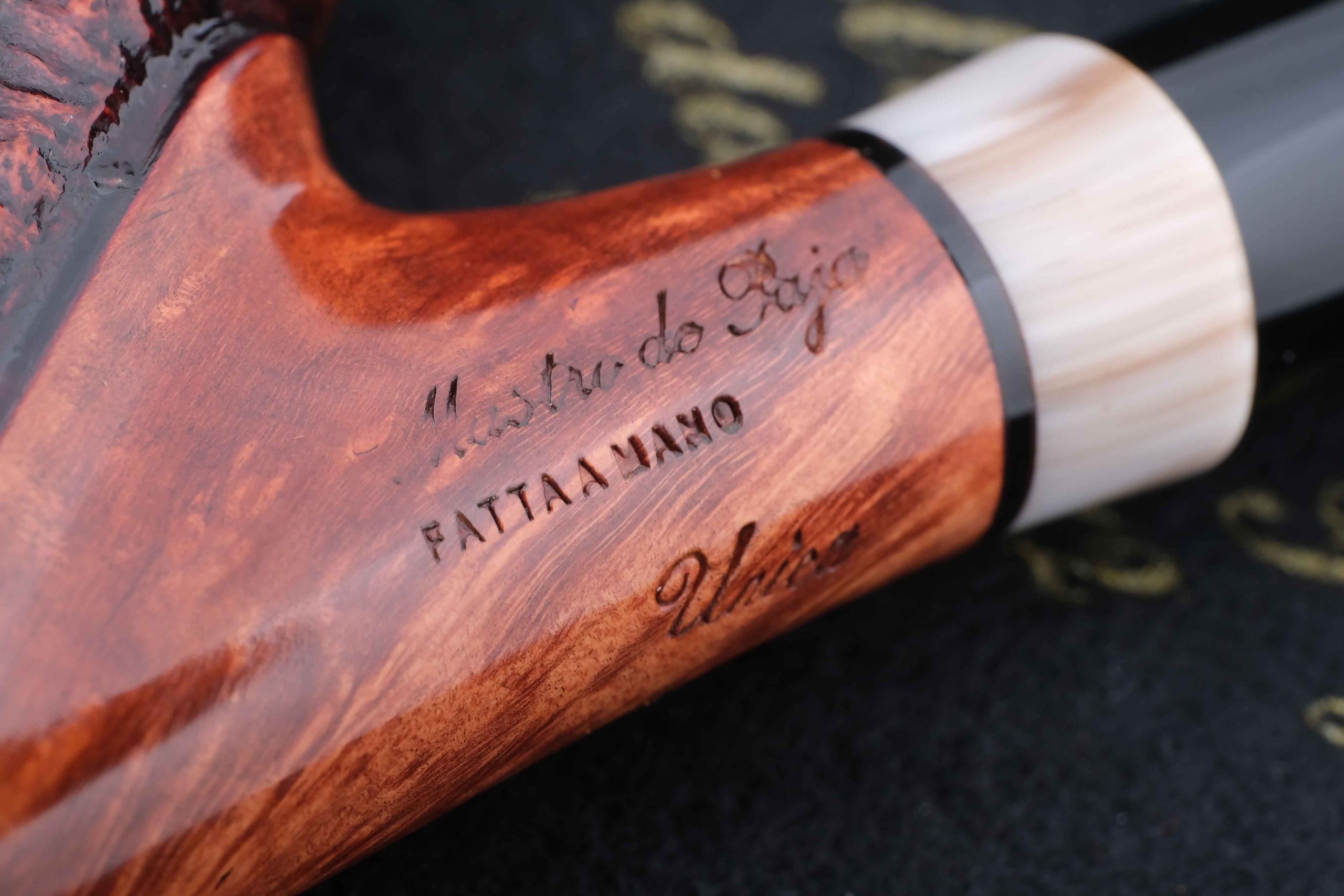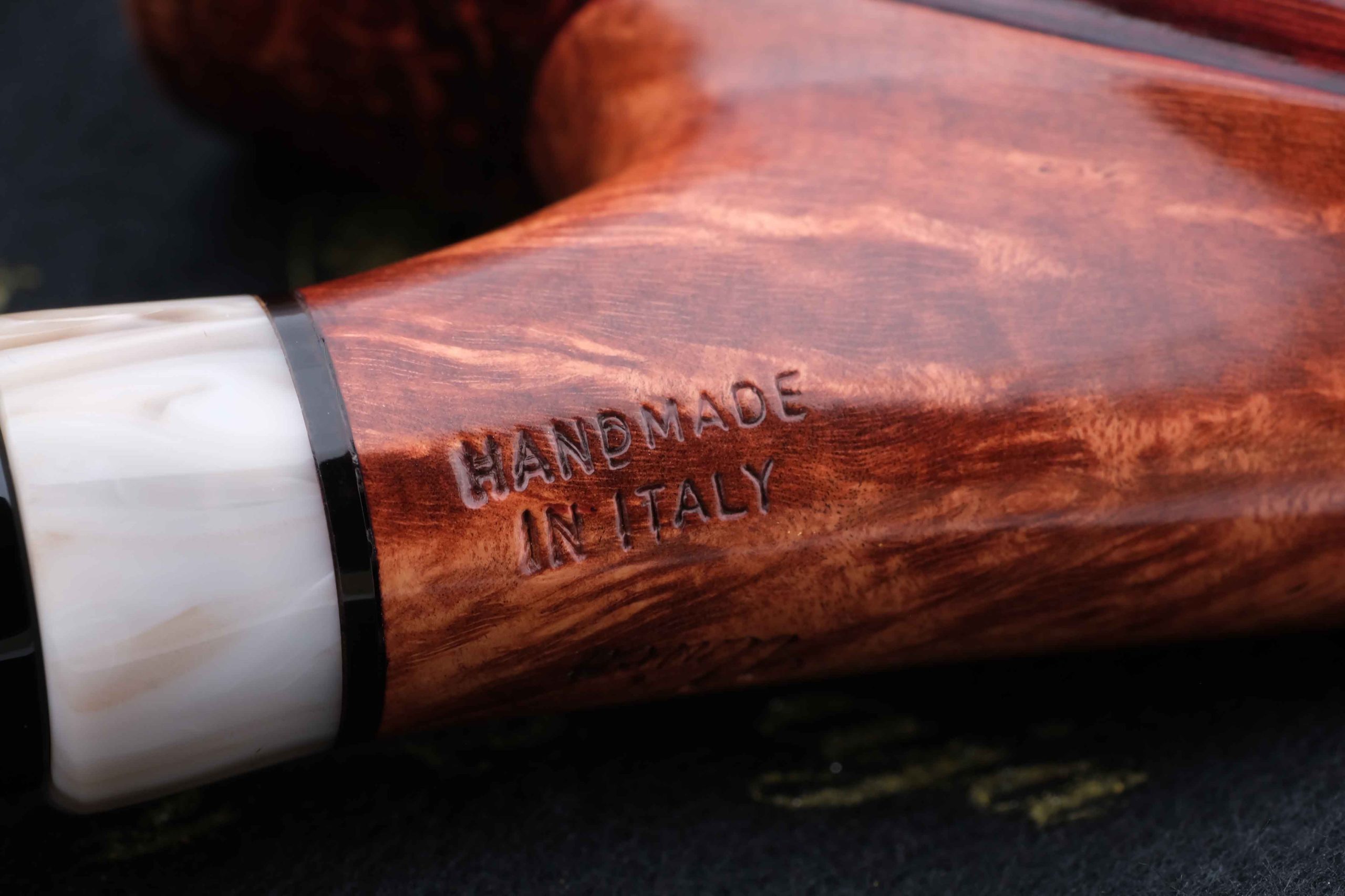 Легкая изящная трубка модели Stand-Up из мастерской Мастро де Пайа. Принадлежит к лимитированной серии Unica, где каждый экземпляр неповторим, имея свой индивидуальный дизайн. Кольцо на чубуке — олений рог. Фильтр 3 мм. Вес 48 гр. Длина трубки 15 см. Диаметр чашки 31 мм. Высота чашки 60 мм. Диаметр табачной камеры 20 мм., глубина 45 мм. В комплекте фирменный кисет и подарочная коробка. Ручная работа, единственный экземпляр.