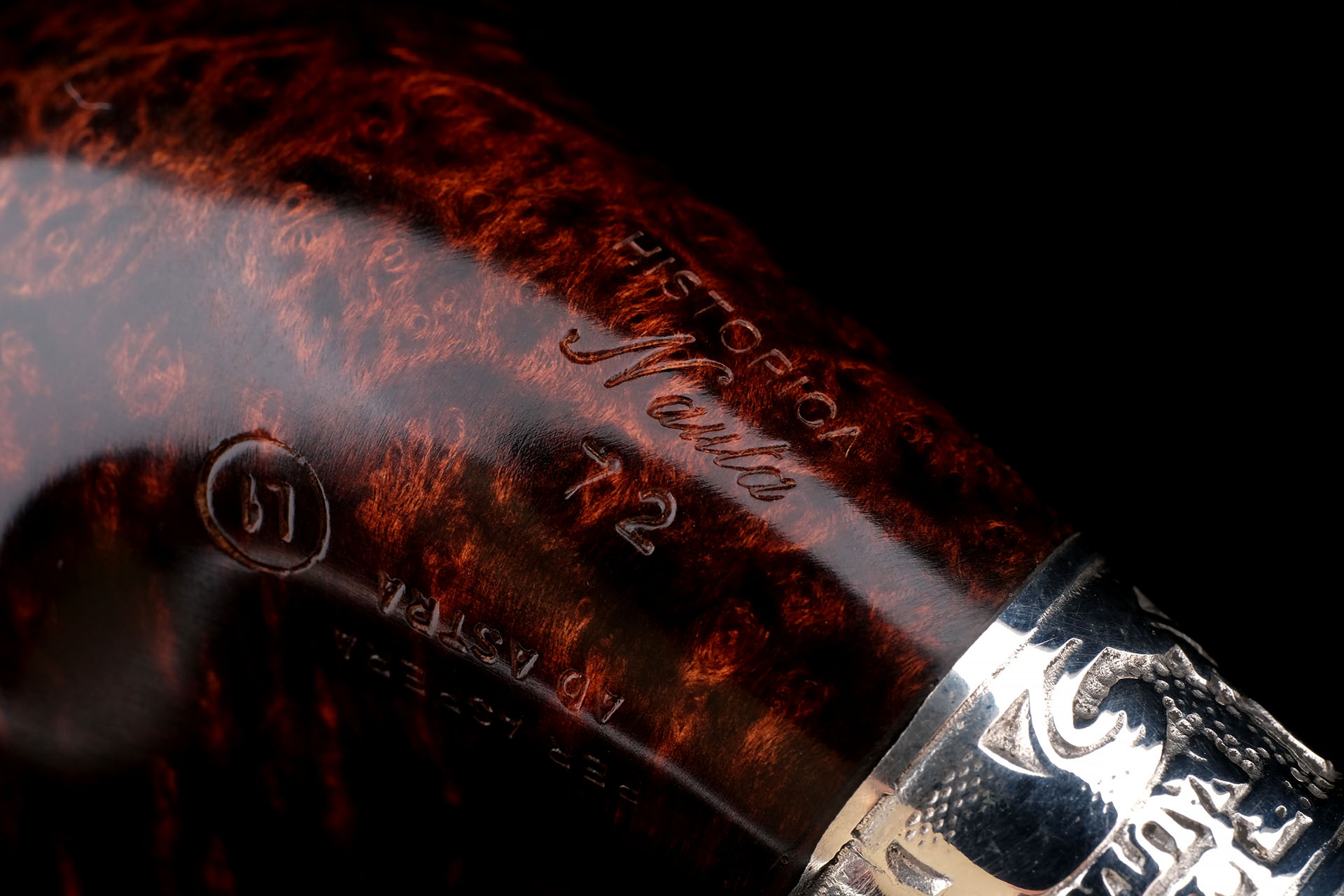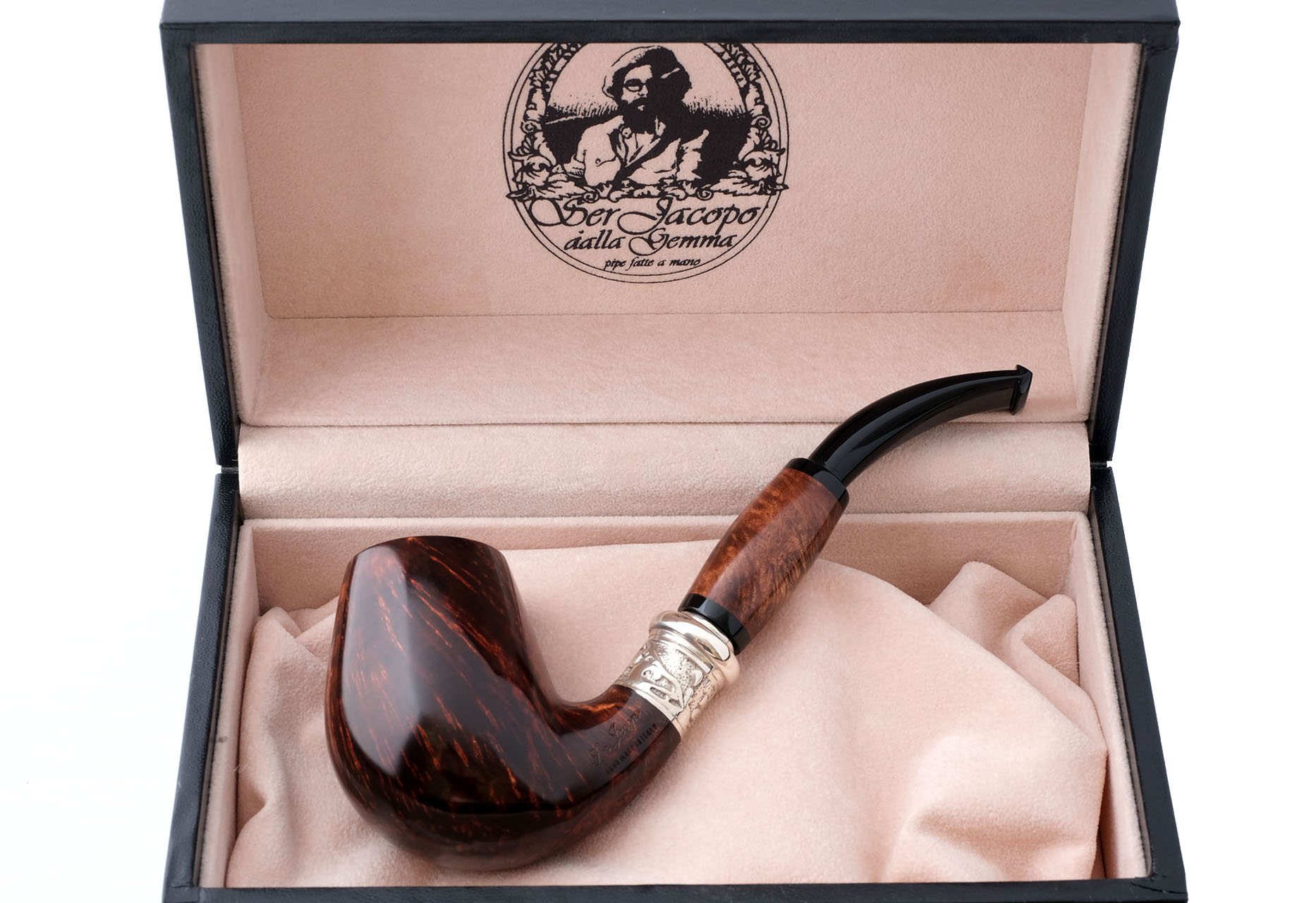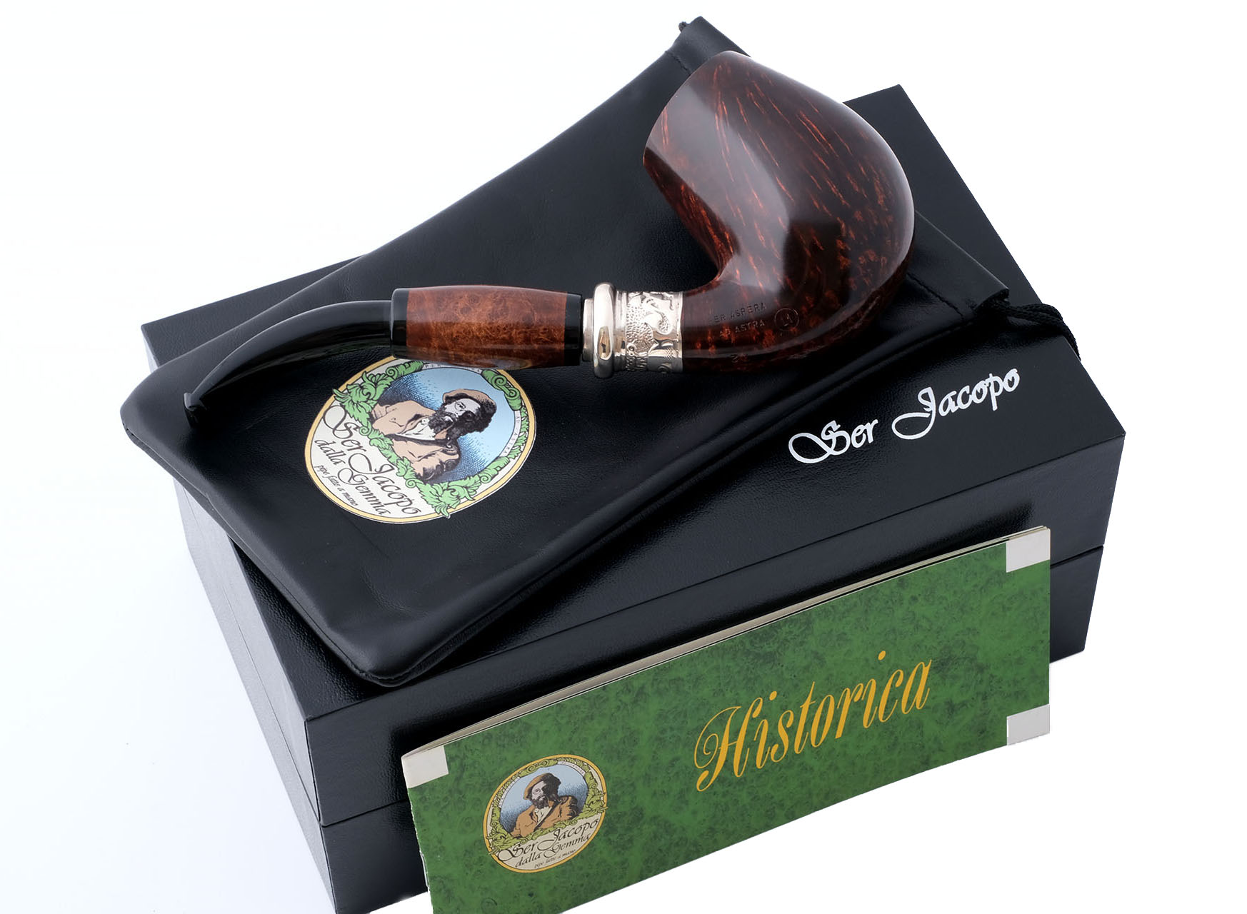 Авторская курительная трубка Historica NAUTA из серии, посвященной ранним работам Джанкарло Гуиди — основателя Ser Jacopo. Было выпущено 100 таких трубок в разных градациях. Каждый экземпляр имеет свой порядковый номер, выбитый на чубуке. На трубке выбит девиз мастерской Ser Jacopo «PER ASPERA AD ASTRA» ( Через тернии к звездам, лат.), маркировки: Ser Jacopo, Historica, Nauta, Hand made in Italy, грэйд L1 и уникальный номер. Двойное кольцо выполнено из массива серебра 925 пробы. Вставка на чубуке из бриара. Фильтр 9 мм. Вес 120 грамм. Длина трубки 17 см. Диаметр чашки 50 мм, Высота чашки 68 мм. Диаметр табачной камеры 20 мм., глубина 58 мм. В комплекте подарочная шкатулка, кисет для трубки и буклеты компании Ser Jacopo. Ручная работа.
