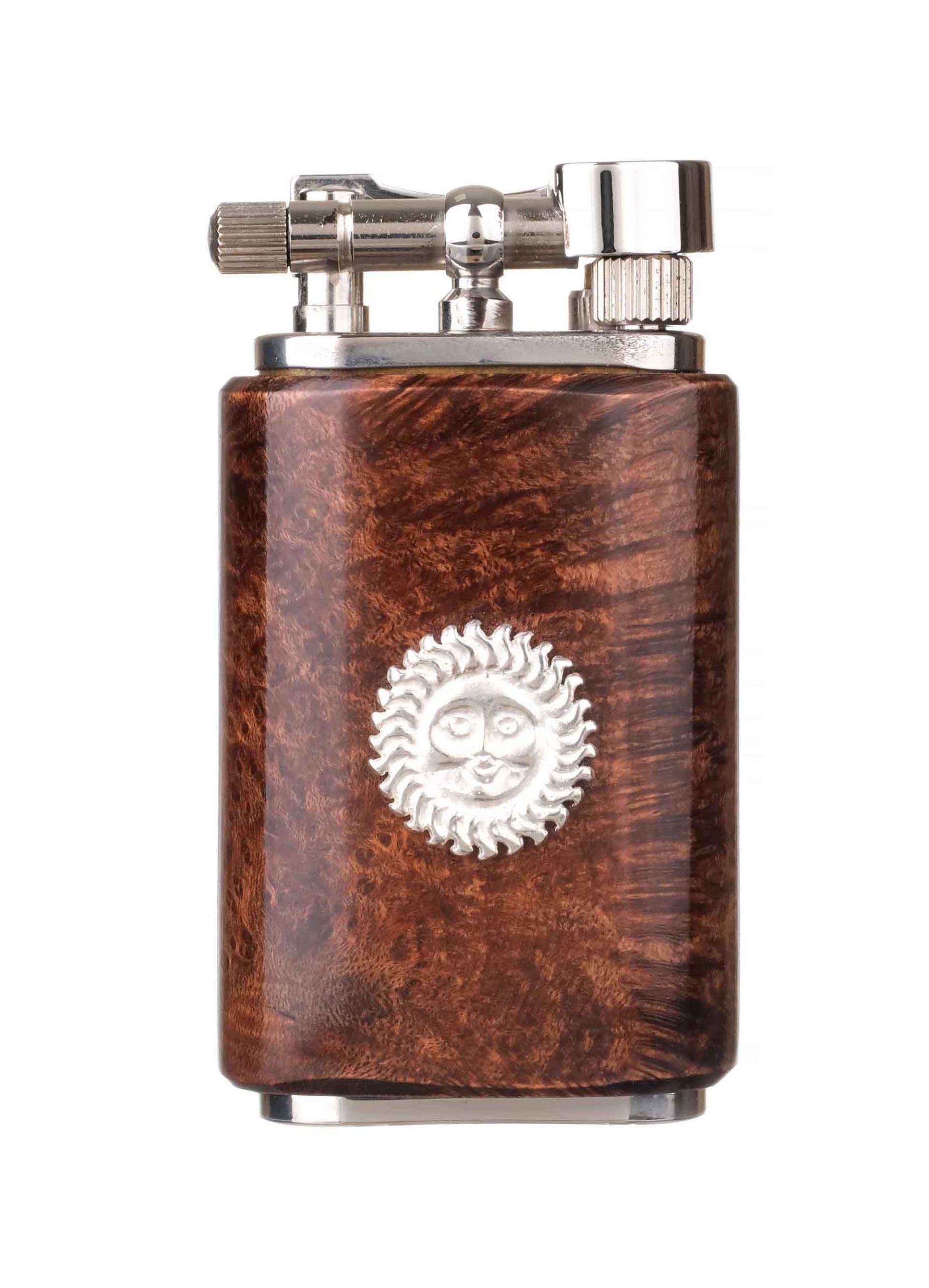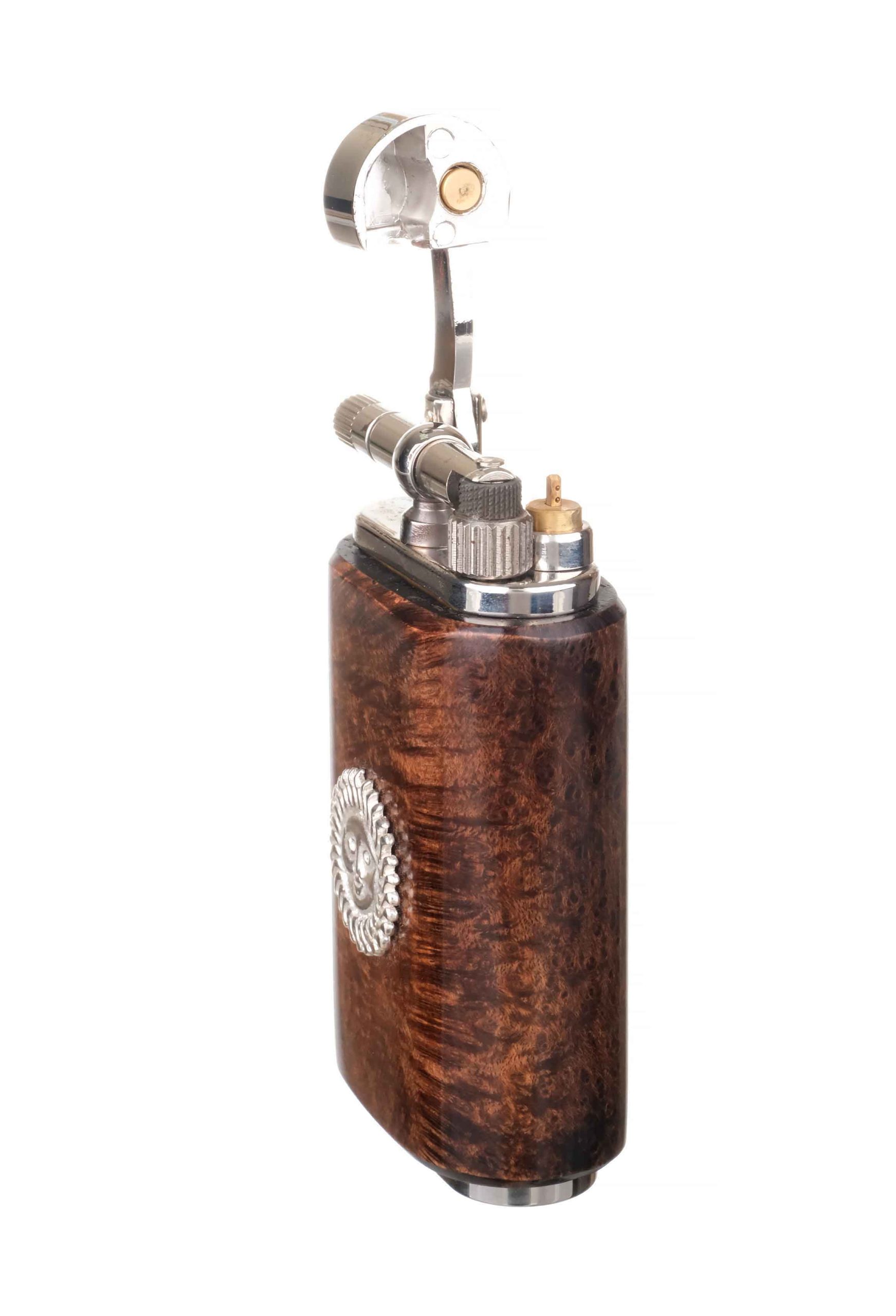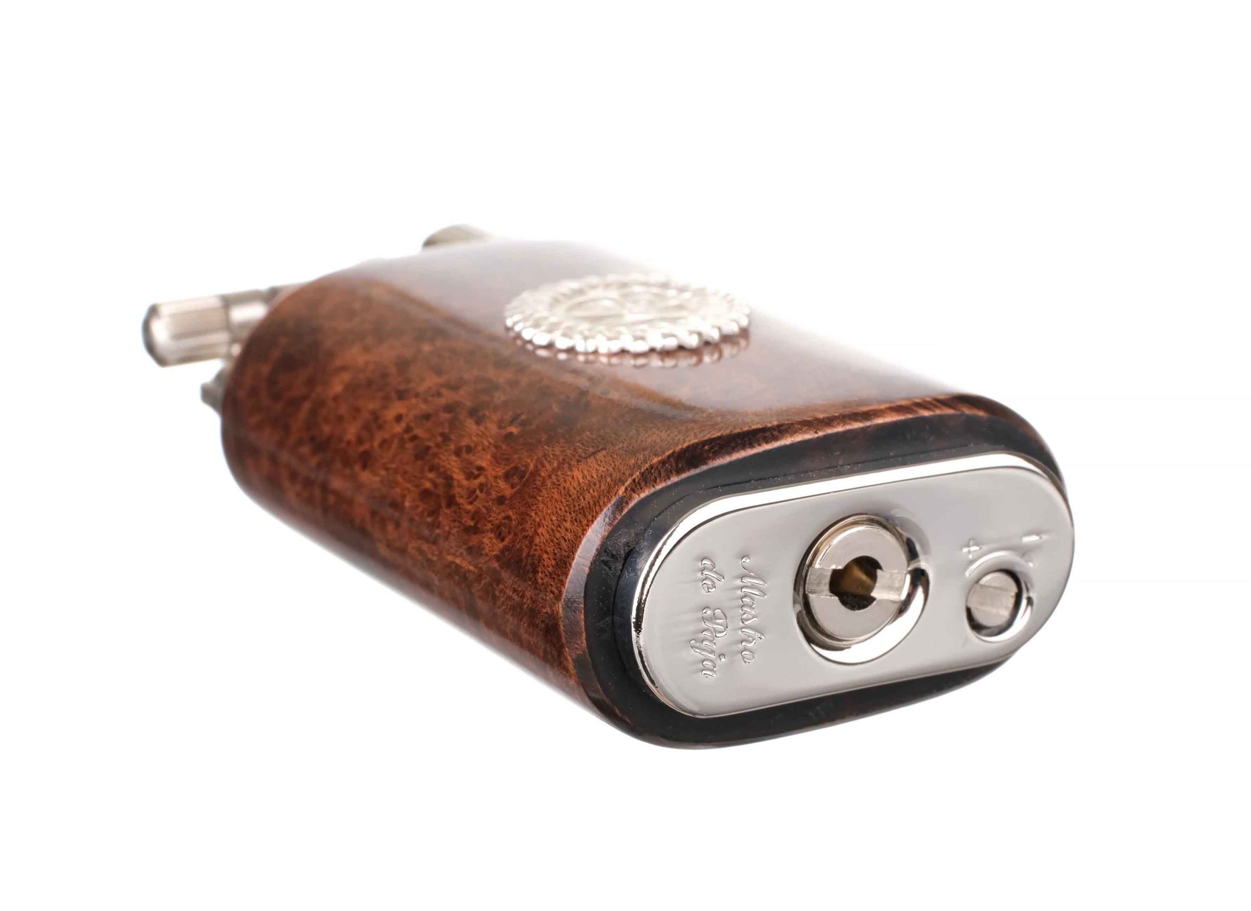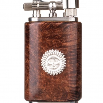 Трубочная газовая зажигалка с надежным кремневым механизмом поджига. Изделие премиум-класса от итальянских мастеров из компании Mastro de Paja, всемирно известной своими курительными трубками и аксессуарами. Внешний корпус выполнен из массива бриара — корнекапа древовидного вереска, красивого и дорогого материала, из которого изготавливаются курительные трубки. Символ солнца — эмблема компании Mastro de Paja выполнена из серебра 925 пробы. Заправка газовым баллончиком со стандартным наконечником. Переходник не требуется. Заправочный клапан и винт регулировки высоты пламени находятся снизу. Кремень в механизме поджига универсальный. Для его замены в процессе эксплуатации необходимо выкрутить наружный торцевой винт в верхней части зажигалки, вынуть старый кремень и заменить на новый. Поставляется в фирменном кисете и подарочной коробке с буклетом Mastro de Paja.